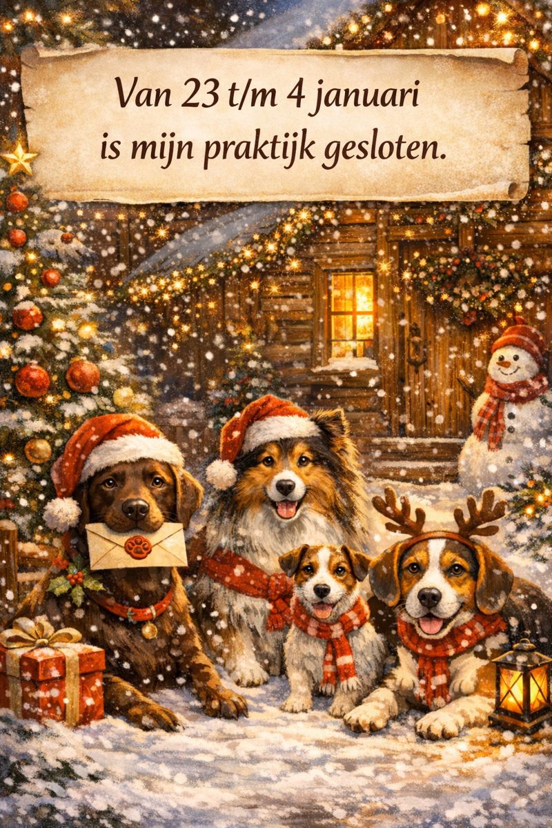 ![]() | Voor het maken van een afspraak in het nieuwe jaar ga je naar afspraak maken. Voor vragen vul je het contactformulier in, deze zal ik ook tijdens de vakantie beantwoorden. Voor spoed bij vermissing of onhoudbaar probleemgedrag stuur je mij een Whatsapp bericht op 0652472625. Hele fijne dagen gewenst en tot in 2026! |
